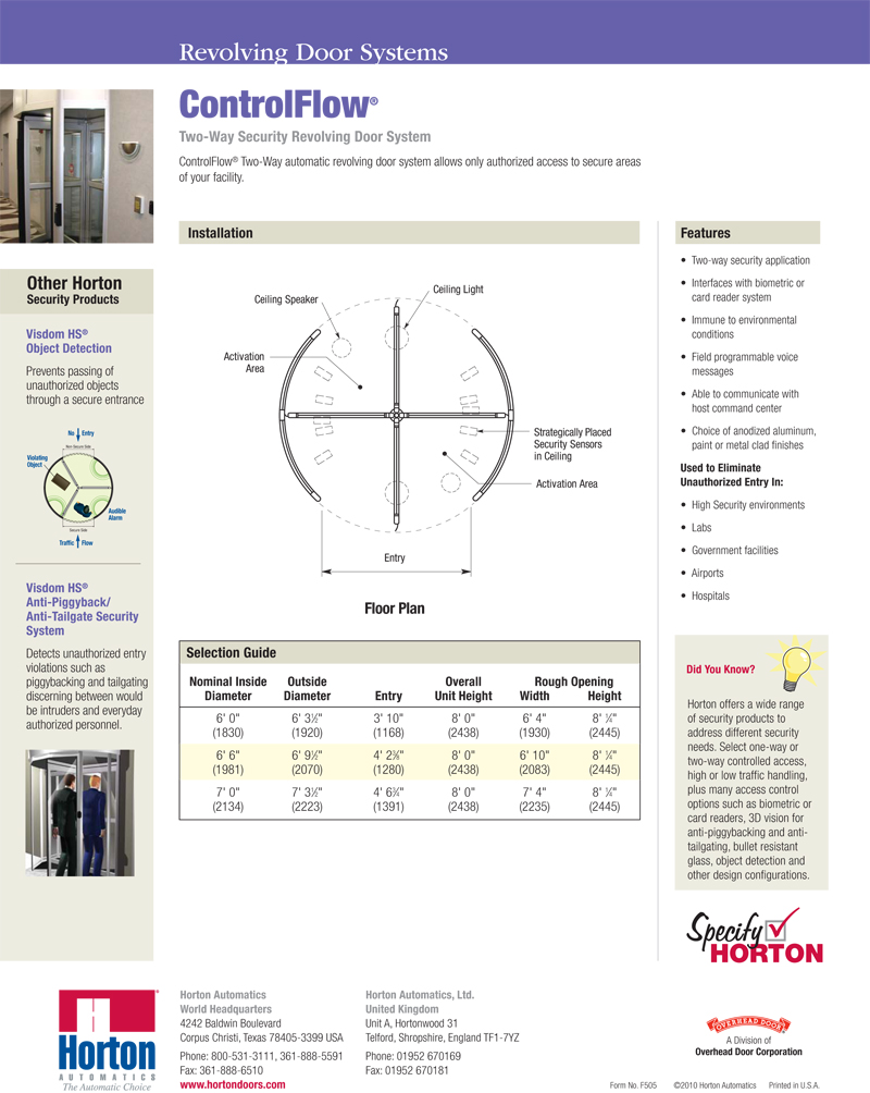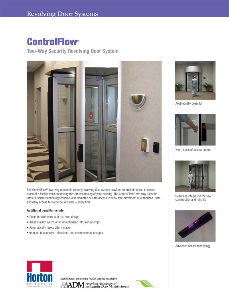 Cửa tự động Horton cung cấp một loạt các hệ thống cửa xoay tự động, an ninh và cửa đẩy tay để đáp ứng nhu cầu lưu lượng người qua lại của các lối đi chính, kiểm soát chi phí điện năng và cung cấp các lối vào hấp dẫn về mặt kiến trúc.
